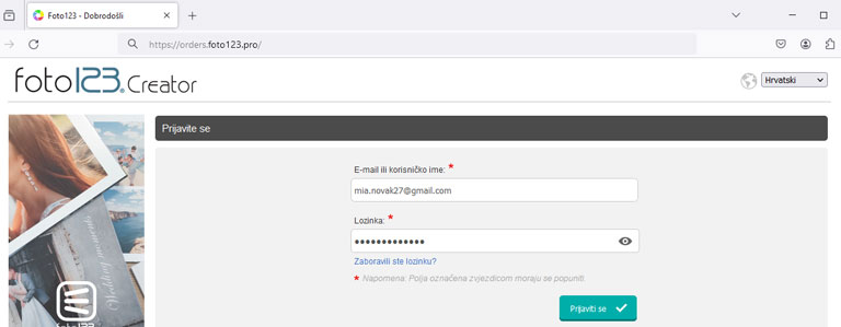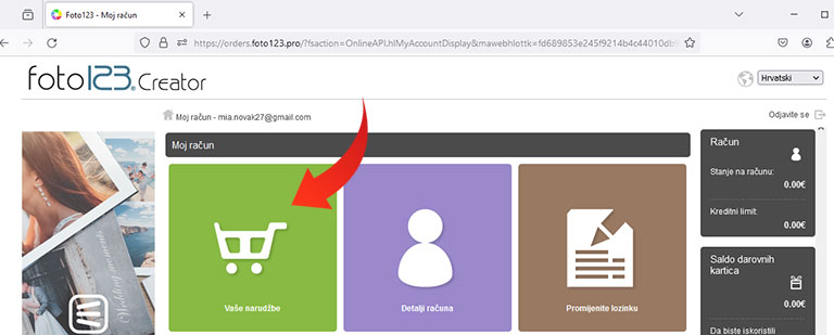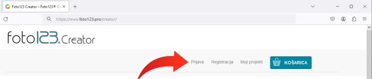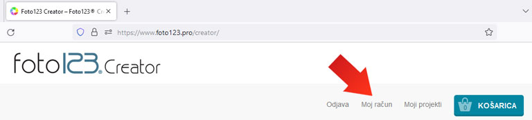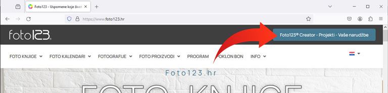 - U svom web pregledniku otvorite našu web stranicu www.foto123.hr i kliknite gornji desni gumb “Foto123® Creator – Projekti – Vaše narudžbe”